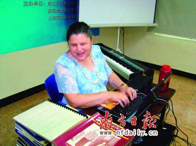 前日,在云浮市區(qū)的唯特教育培訓(xùn)中心,凱文老師時(shí)而在盲人電腦上敲著英語單詞,時(shí)而站起來向?qū)W生提問。她還一邊彈電子琴,一邊教學(xué)生唱英文歌(見圖)。