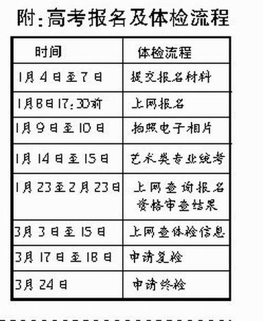 2008年高考報名時間為1月18日-23日,2009年高考報名時間為1月4日-8日。省考試局稱,報名時間之所以提前,是因?yàn)榻衲甏汗?jié)來得早,教育部要求各省必須在春節(jié)前完成藝術(shù)專業(yè)統(tǒng)考工作。