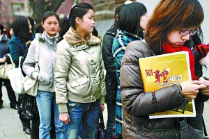 本報(bào)訊 今天上午9時(shí),2009年女大學(xué)生專場(chǎng)招聘會(huì)在位于德勝門的北京畢業(yè)生就業(yè)市場(chǎng)舉行。離招聘會(huì)開始還有半小時(shí),門前卻已蜿蜒排起了幾百米的長(zhǎng)隊(duì)。截止記者發(fā)稿時(shí),應(yīng)聘學(xué)生已突破了四千人。