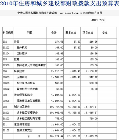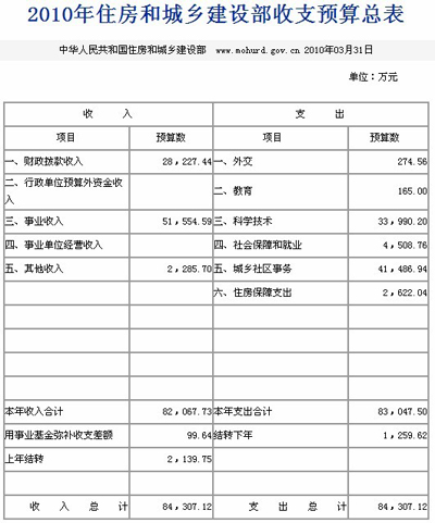 中新網(wǎng)3月31日電 住房和城鄉(xiāng)建設部網(wǎng)站今日發(fā)布住房和城鄉(xiāng)建設部部2010年部門預算表,其中包括2010年收支預算總表以及2010年財政撥款支出預算表。這是繼國土資源部及財政部公開部門預算后,第三個公開預算的中央部委。