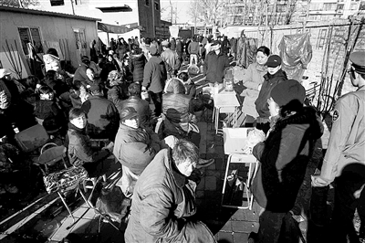 晚9時后,居民們有的鉆進帳篷里,有的則用棉大衣把自己緊緊地包裹起來,不時喝一口暖壺中的熱水,或是來一口小酒。人群中不時傳來幾句議論,話題都是“你家能分到多大的房子”。