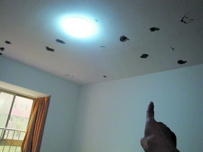 12月7日中午,在物業(yè)公司服務(wù)的王小姐走進租住的岳麓區(qū)西岸潤澤府小區(qū)6棟307房,立即發(fā)出一聲尖叫,她發(fā)現(xiàn)自己本來干凈整潔的床鋪上散落著大大小小的水泥塊,而本來光潔白亮的天花板出現(xiàn)了幾十個洞。“當時第一感覺以為是發(fā)生了地震。細數(shù)發(fā)現(xiàn),竟有29個洞!焙献獾囊荒泻⒆痈嬖V記者。后來大家明白了,這是樓上裝修引起的問題。