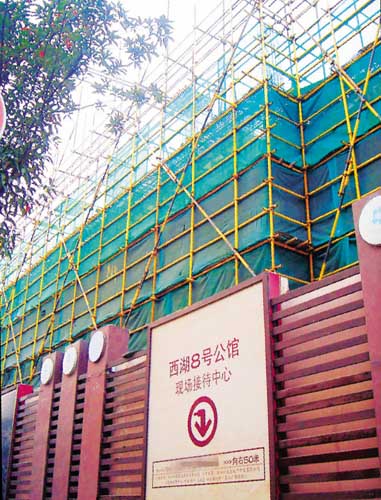 在吳山廣場邊上的四宜路上,記者找到了這個占地僅5980平方米的樓盤。因為臨近西湖,有限高規(guī)定,所以在一片二手房簇擁中的西湖8號公館并不是那么顯眼。整個樓盤僅有兩幢房子,而且中間還隔著一幢破舊的樓房,看起來,樓盤的小景觀并不是特別理想。