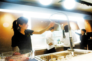 廚房的家電越來越多,如果一個電器占一個地方,本來就不大的廚房空間肯定顯得雜亂。不妨考慮訂做專門的柜子把微波爐、電飯鍋等小件廚房電器利用縱向的空間疊放起來。柜子做成豎放的一格格,每一格放一個電器,就能騰出更多的橫向空間,這樣廚房也能更整潔美觀。如果固定空間不夠用,可設(shè)置一個帶有滑輪的物品架,做飯的調(diào)料、鏟子和其他工具可以搬到手邊隨時取用,不用的時候收起來放到隱蔽處,給廚房增加一個靈活的小空間。(陳穎)