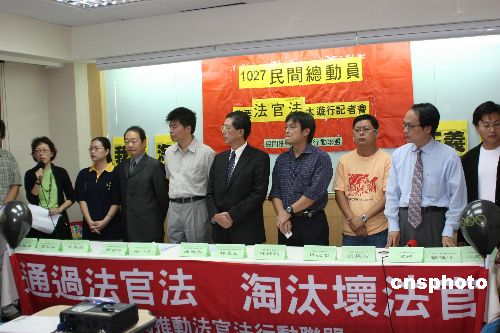 臺灣“民間推動法官法行動聯(lián)盟”十月二十五日召開記者會宣布,將于十月二十七日在臺北中正紀念堂前廣場發(fā)動“我要法官法”大游行。組織者說,很多人進法院是要追求公平正義,但卻因不良的法官,受到再次傷害,法官法法案中最重要的就是法官的淘汰機制。在臺灣, 法官法已推動十幾年,至今尚未通過。中新社發(fā) 耿軍 攝