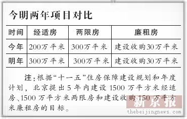 明年北京將建設(shè)300萬平方米經(jīng)適房、300萬平方米兩限房并建設(shè)收購30萬平方米廉租房。其中,經(jīng)適房開工面積比今年增加了100萬平方米。昨日,位于朝陽區(qū)的常營經(jīng)適房、常營兩限房項目同時開工,至此北京今年的保障住房和兩限房的開工指標全部完成。