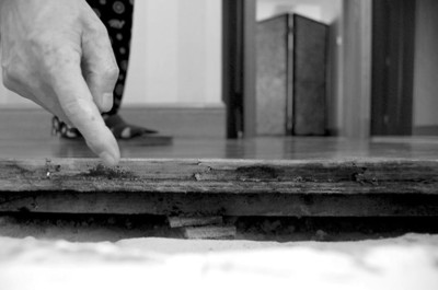 “距我們反映主衛(wèi)門框下面滲水、造成主臥的地板部分褪色、門框底框腐爛、門套底部貼面有氣泡突起、地磚大面積發(fā)黃這些問題已經一個月了。有人來看過也說是‘防水沒做好’,但沒單位負起這個責,徹底解決這件事,只是互相推諉。作為弱勢群體的我們只能不停地反映、等待,F(xiàn)在被挖開的地方,每天都會有小蟲爬出來。哎,花600多萬買的房子,浴缸卻只能看不能用。 ”陳老先生的老伴邊說邊指著旁邊畚箕里她掃出來的黑色小蟲子。對此,物業(yè)部門也派人檢查了好幾次。
