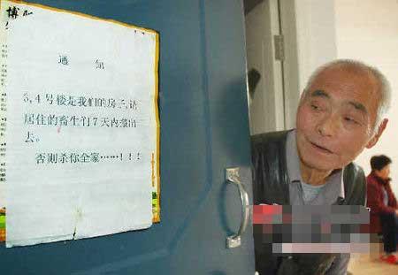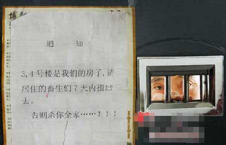 該小區(qū)物業(yè)辦工作人員說,十天前,小區(qū)里突然出現(xiàn)了十幾張通知,落款未寫單位,但內(nèi)容很恐怖:如果三、四號(hào)樓的住戶不搬家,就殺他全家。“整個(gè)小區(qū)的人都人心惶惶的,特別是三、四號(hào)樓的200多個(gè)住戶,日夜守在家里,生怕沒人的時(shí)候房子被人強(qiáng)占!痹摴ぷ魅藛T說。