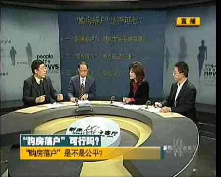 李小萌:歡迎來到正在直播的《新聞會(huì)客廳》。金融危機(jī),樓市低迷,手里拿著錢想買房,依然覺得房價(jià)過高的購房者著急,開發(fā)商著急,政府也著急,著急就要想辦法,幾天以前,我們?cè)谟懻撡彿客硕愓呤欠窨尚校欠窈侠。這兩天我們又看到消息說,廣東省將會(huì)成為繼多個(gè)城市之后首個(gè)實(shí)現(xiàn)購房落戶政策的省份,一時(shí)間人們也在討論購房落戶這個(gè)政策。今天我們也來湊個(gè)熱鬧,今天請(qǐng)到的嘉賓是北京大學(xué)法學(xué)院教授王錫鋅。旁邊一位是北京師范大學(xué)房地產(chǎn)研究中心教授董藩。他們兩位上次在關(guān)于購房退稅政策的時(shí)候就是各執(zhí)一詞,爭(zhēng)個(gè)不相上下,看看今天觀點(diǎn)是不是會(huì)一致。另外我們還請(qǐng)到了媒體觀察員吳定平,也歡迎你。我們先來通過一段短片來了解一下購房落戶政策。