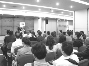 拍賣師萬華介紹,今年拍賣會的火熱與去年的冷清場面形成鮮明對比。在去年樓市低迷時(shí)期,拍賣現(xiàn)場常常只零散地坐著10多個(gè)競買人,經(jīng)常有房產(chǎn)因參與競拍人數(shù)不足兩人而流拍,只有進(jìn)行多次調(diào)價(jià)多次拍賣,還有許多房產(chǎn)無人競價(jià)而以底價(jià)成交,即使有人競買也是寥寥數(shù)人。到拍賣后半場,由于有人提前離場,稀稀拉拉的幾個(gè)人,也再?zèng)]舉牌熱情。