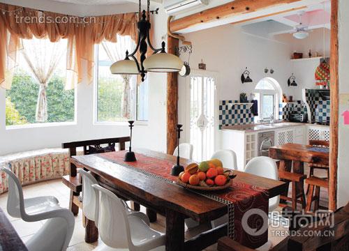 玄關(guān)是室內(nèi)的第一視覺(jué)焦點(diǎn),小米用藍(lán)白兩色為這個(gè)家點(diǎn)了題,與房子的外立面呼應(yīng):白色的墻面,藍(lán)色的門板、鞋柜、天鵝頭木盆描繪著浪漫的地中海風(fēng)情;客廳里條紋圖案的布藝沙發(fā)和花朵圖案的布藝貴妃椅則是典型的鄉(xiāng)村風(fēng)格,主題墻上點(diǎn)題式地掛起兩幅與海岸相關(guān)的油畫;餐廳里,小米玩起了混搭——上等老榆木的厚重餐桌,兩頭各放一張老榆木餐椅,氣勢(shì)穩(wěn)重,兩側(cè)則是四張?jiān)O(shè)計(jì)感很強(qiáng)的白色Panton椅,起初你會(huì)覺(jué)得有點(diǎn)大膽,再認(rèn)真審視,又覺(jué)得這種碰撞很和諧,小米說(shuō):“我喜歡來(lái)點(diǎn)驚喜的感覺(jué),這椅子的線條很優(yōu)美,像海浪般起伏,與老榆木的感覺(jué)一個(gè)新,一個(gè)舊,一個(gè)輕,一個(gè)重,相映成趣!