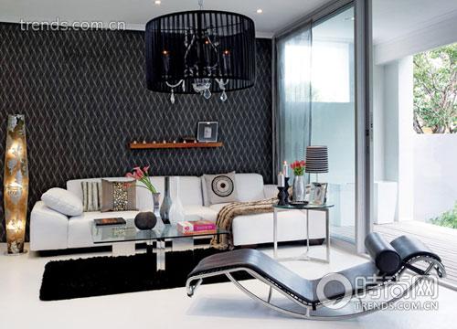 墻壁大面積使用黑底白紋的圖案,給地板留出足夠簡潔的空間。沙發(fā)上方做出的原木架將發(fā)散的目光重新聚集,照片擺在一側(cè),圓扁的小蠟燭悄悄亮起,讓氣氛一下活躍起來。水晶吊燈線條優(yōu)美,外面籠罩了一層黑色豎紋裝飾,與沙發(fā)前純黑的地毯遙遙相望,而躺椅完美的弧度在提供給主人充足的休息之余,也配合著前兩者成為屋內(nèi)最為深暗的色彩之一。橫排的白色沙發(fā)顯露出十足的貴族氣息,高高豎在一側(cè)的地?zé)粢蚕鄳?yīng)地做出漂亮的大花圖案,亮燈時(shí)花朵若隱若現(xiàn),朦朧之美呼之欲出。