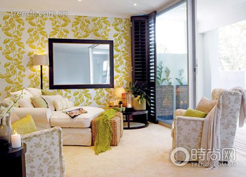 布藝沙發(fā)也同樣遵循了花色與純色混搭的原則,奶白色的雙人沙發(fā)用淺灰綠的靠包來點綴,分坐兩旁的單人沙發(fā)則使用枝葉與花朵的暗紋來處理,旁邊配上深色的小茶幾,精致的圓肚細(xì)頸花瓶里悄悄探出一枝素雅的白色蝴蝶蘭,跟玻璃罩內(nèi)點燃的白色蠟燭相映成趣。