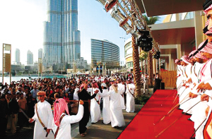 塔旁的迪拜噴泉以275米的破紀(jì)錄水柱吸引世人目光。啟用典禮整個(gè)過(guò)程由當(dāng)?shù)孛襟w作全球高清直播,有400多家全球媒體參與報(bào)道,全球20億觀眾收看。