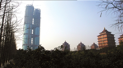 目前,摩天大樓初見規(guī)!60層高的主樓已經(jīng)封頂,三足鼎立,托起一個(gè)巨大的球體,5個(gè)空中花園,聯(lián)通三足。