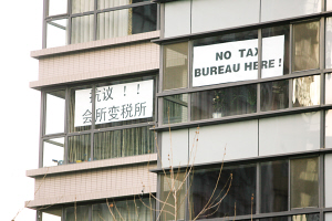 半年來,得知地區(qū)稅務(wù)所即將進駐小區(qū)會所后,朝陽區(qū)金地國際花園的業(yè)主多次向開發(fā)商、CBD管委會反映情況,但收效甚微。部分業(yè)主在自家窗上貼上標語以示抗議。