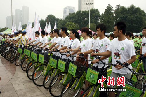 中新網(wǎng)武漢7月10日電 (艾啟平 胡志強(qiáng) 易慧)10日上午,“綠色長征、傳播低碳——百企組團(tuán)千里騎行看世博”在武漢市漢口江灘啟動。