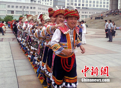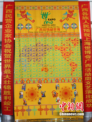 今天,由中國工藝織錦大師譚湘光和8名“織女”經(jīng)過96天織就的世界最大壯錦,在“廣西活動(dòng)周”開幕式上贈(zèng)獻(xiàn)給上海世博會(huì),壯錦長6.2米,寬3.6米。同時(shí),“世界最長板鞋”亦亮相“廣西活動(dòng)周”,該板鞋共23節(jié),每節(jié)2.2米,總長為50.6米,由115位身穿少數(shù)民族盛裝的青年男女腳踏板鞋喊著號子向前行走。(完)