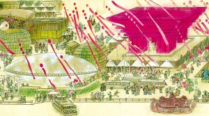 在中國館省區(qū)市館入口處,這幅長21米、寬0.47米的繪畫作品吸引了每一個經(jīng)過的人。畫卷描繪了浦江兩岸世博園區(qū)內(nèi)所有的場館以及近7000個游人,畫面上南浦、盧浦大橋橫跨兩岸,路上車輛、江面游輪、空中飛艇往來繁忙,園區(qū)內(nèi)形形色色的建筑中間人流熙熙攘攘,一派熱鬧繁華的景象。有意思的是,長卷不僅展現(xiàn)了世博園區(qū)恢宏的場景,還刻畫了許多生動的細(xì)節(jié),如畫中有兩個孩子在沖向他們喜歡的場館途中,男孩的帽子被風(fēng)吹走了;一對情侶在深情擁吻;“小白菜”勸說躺在長椅上睡覺的參觀者等。