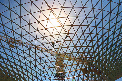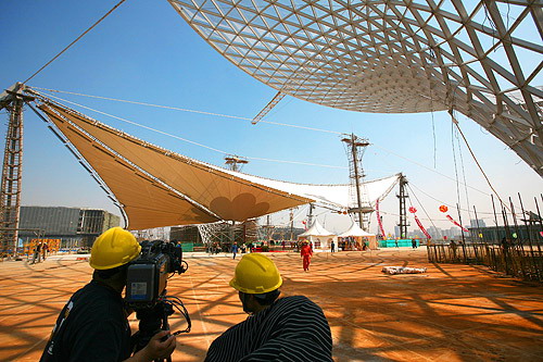 中新網(wǎng)4月30日電 據(jù)上海世博會(huì)官方網(wǎng)站消息,今天,世博軸上首批兩個(gè)喇叭狀的陽光谷正式落成,同時(shí)頂棚膜結(jié)構(gòu)張拉啟動(dòng),這標(biāo)志著世博軸上部主體工程即將全面完工。上海世博會(huì)執(zhí)委會(huì)專職副主任鐘燕群、上海世博局副局長丁浩等出席儀式。鐘燕群宣布啟動(dòng)世博軸頂棚膜結(jié)構(gòu)張拉。