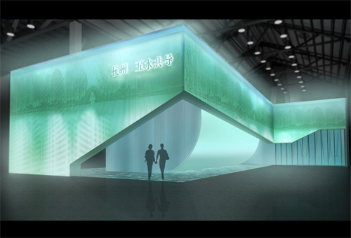 杭州館展區(qū)外立面采用城市方舟的設(shè)計主題,五水共導(dǎo)的水幕卷蓬猶如偉岸的城市方舟從中駛出,使參觀者在遠距離就能感受到展館的氛圍。最新的光電技術(shù),將營造出一個晶瑩剔透水晶般的展館,并以醒目的位置,展示獨特的杭州城市標(biāo)志。此外,弧型的水幕若隱若現(xiàn),當(dāng)參觀者踏入展館的那一刻,周圍以及頭頂環(huán)繞的環(huán)境將共同營造出一座聞名中外的山水城市。