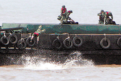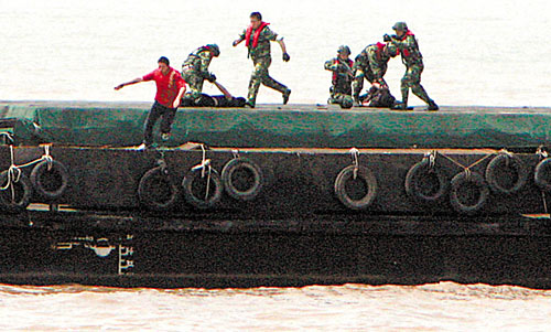 “跳幫!”一聲令下,10余名海警官兵利用兩船靠近和波浪起伏間隙最小的瞬間,飛身魚躍,紛紛越過船艇護(hù)欄,跳到貨輪上。海警擊斃一名“恐怖分子”,制伏兩人,另一名“恐怖分子”慌不擇路跳海,也被飛身入海的海警抓獲。此時藏匿在機(jī)艙的4名“恐怖分子”瞅準(zhǔn)空隙,駕艇逃竄。
