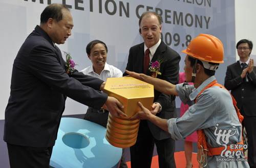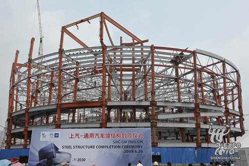 8月26日上午,2010年上海世博會(huì)上汽-通用汽車館鋼結(jié)構(gòu)正式封頂,標(biāo)志性的螺旋型建筑外觀雛形初現(xiàn)。上海世博局黨委副書記許偉國、上海汽車副總裁肖國普、通用汽車中國公司總裁兼總經(jīng)理甘文維等出席封頂儀式,共同見證最后一顆螺釘釘入鋼梁。