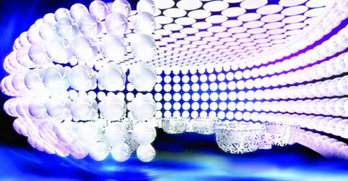 幻影繡球——在展示大廳中心懸墜直徑在60—80厘米之間的幻影繡球,繡球外觀經(jīng)時(shí)尚化、科技化處理,通體為透明材質(zhì),內(nèi)嵌4塊顯示屏達(dá)到全角度視頻展示,通過(guò)地面投影、LED視屏與照片傳輸技術(shù)融為一體的時(shí)尚科技完成即時(shí)成像,當(dāng)參觀者走過(guò)幻影繡球下時(shí),繡球上便會(huì)映出相應(yīng)影像。
