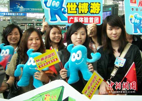 中新網(wǎng)廣州4月19日電 (記者 莫非 通訊員 林月明)4月19日中午,白云機場國內(nèi)出發(fā)廳人氣爆棚,數(shù)十名廣東游客首嘗世博游“頭啖湯”,成為廣東進入世博會游覽的第一批游客。