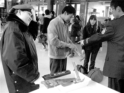 “根據(jù)現(xiàn)在的規(guī)定,您攜帶的錘子不得攜帶進(jìn)站上車!币幻丝驮跀y帶著錘子等工具通過安檢儀后,被安檢人員攔下。據(jù)安檢人員介紹,現(xiàn)在的安檢力度基本和奧運期間持平,像剪刀、大型水果刀等物品都是不允許攜帶上車的。旅客被查獲的物品,可暫時保存在進(jìn)站口由其朋友領(lǐng)走,或直接辦理托運。
