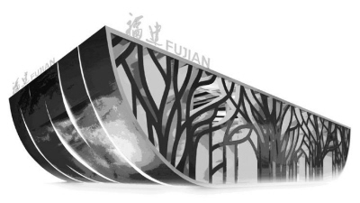 福建地處祖國(guó)東南沿海,面向臺(tái)灣海峽,依山傍海,擁有豐富的生態(tài)資源和漫長(zhǎng)的海岸線。因此,福建館整體外觀設(shè)計(jì)為船形,以“綠、藍(lán)、白”為主色調(diào),正面為綠色榕樹(shù)造型,兩側(cè)船頭為藍(lán)色大海影像墻,頂部為白色橫梁,充分體現(xiàn)福建山中有城、城中有山,城海相連、海城一色的景象。整個(gè)展館像一艘在臺(tái)灣海峽中乘風(fēng)破浪的“生態(tài)船”,展現(xiàn)了福建作為綠色大省的風(fēng)采。