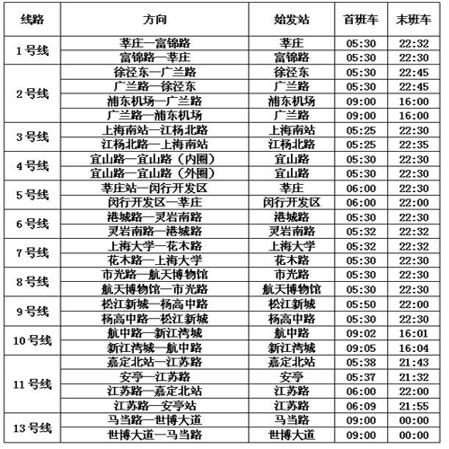 軌道交通4、6、7、8、9五條涉博線路在常規(guī)末班車后,將在世博園周邊站點加開加班列車,除重點涉博車站以外,其他途經(jīng)車站只可下客出站,不可進站上客和換乘。加開列車末班車時間為0:10,運營間隔約為15分鐘一班。具體車站的首末班車時間還可查看各車站公告、至上海地鐵官網(wǎng)(/) 進行查詢或撥打地鐵服務熱線64370000進行詢問。