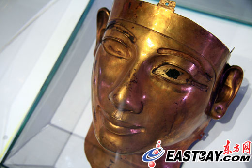 據(jù)介紹,“法老舍松契二世面具”誕生于公元前890年,在東尼羅河三角洲地帶被發(fā)現(xiàn)。黃金面具的左眼有一塊黑色,類似于眼珠,工作人員告訴東方網(wǎng)記者,可能是彩色涂料的殘留物,“這個面具的眼睛、眉毛等處在當(dāng)時應(yīng)該有被涂上彩色顏料!