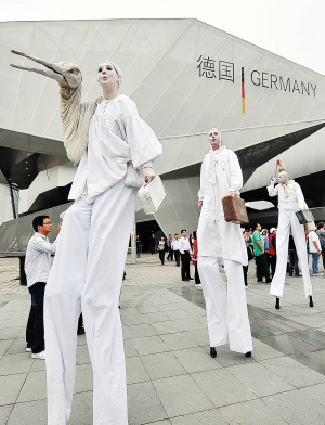 素來以穩(wěn)重、嚴謹著稱的德國人把一座“懸浮在空中的建筑”帶到了上海世博園區(qū),但當看上去不穩(wěn)的德國館建筑單體構成一個平穩(wěn)的整體時,卻強烈地表現(xiàn)出“和諧都市”的主題。今天上午,德國館迎來國家館日。德國館日的活動精彩紛呈。中午時分,在世博軸陽光谷,歐洲青年交響樂團精彩的演奏以及德國嘻哈樂隊的節(jié)奏音樂口技和嘻哈表演輪番上場,德國樂隊“兩居室”則為觀眾帶來最新流行樂曲。而在德國館外排隊等候的人群中,扮相奇特的“巨人”不時與游客打個招呼,帶來陣陣笑聲。