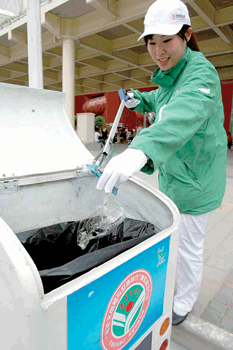 今年的4月6日,董磊帶著由他親自招聘、培訓(xùn)的團(tuán)隊(duì)正式進(jìn)駐世博園。“我的手下有42名員工,負(fù)責(zé)整個(gè)世博園區(qū)4000多個(gè)果殼箱的垃圾收運(yùn)工作!彼嬖V記者,這42名員工每天24小時(shí)輪班在世博園內(nèi)維持環(huán)境衛(wèi)生,而他的工作就是協(xié)調(diào)、管理這些人手。“他們的年齡從40多歲到20多歲不等,幾乎都是各單位抽調(diào)來的骨干。作為一名年輕的80后,我怎么才能讓他們信服我?只有少說多做!倍谡f,由于人手方面的原因,尤其是在一些人流較多的廣場,因?yàn)槔者\(yùn)車不能開進(jìn)去,所以只能人工收運(yùn)垃圾,作為主管的他也要親自上陣!拔颐刻齑蟾乓杖能,也就是每天要收40個(gè)垃圾桶。做得多了,員工就信服了!