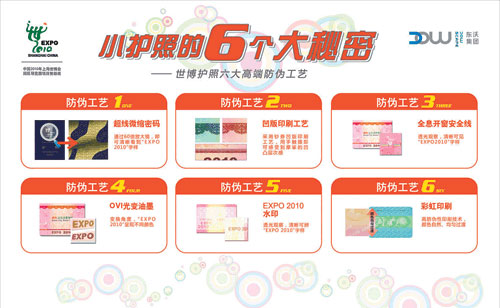此外,記者了解到,改版后的世博護(hù)照還加強(qiáng)了防偽技術(shù)。據(jù)悉,改版《世博護(hù)照》各款產(chǎn)品封面的燙金世博Logo內(nèi)均采用了超線微縮密碼防偽技術(shù),采用60倍的放大鏡觀看,則可清晰看到EXPO2010字樣。這一通常只用于鈔券的高端防偽技術(shù)被運(yùn)用,標(biāo)志著世博護(hù)照的防偽技術(shù)又上一個(gè)新臺(tái)階,同時(shí)也再次提升了世博護(hù)照的珍藏價(jià)值。