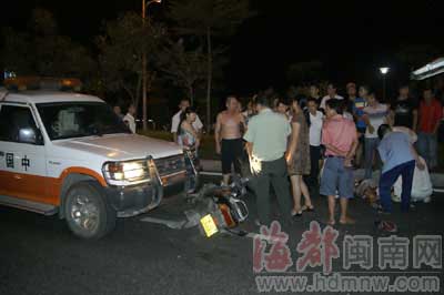 事發(fā)8月17日晚近10時,黃先生說:“太突然了,我一下被撞飛,當(dāng)時馬上暈過去了!碑(dāng)晚,他和幾個同事在江濱路大排檔吃完飯后,分乘兩輛摩托車沿江濱路由東往西行駛,他開的摩托車上載著同事周女士。途經(jīng)洋老洲游泳池附近時,黃先生突然感到后面有車撞來,他和周女士被撞倒并被往前面推行了10多米,接著他就暈過去了。
