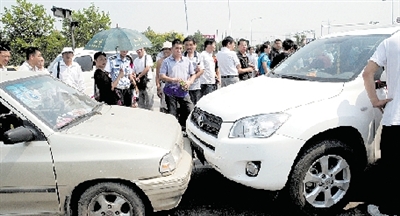 “兩車相撞后,豐田車司機(jī)跳下來,大聲對(duì)我說,他在洛陽報(bào)警多次,說他家里有毒品,可洛陽警方一直不理他。他跑到鄭州,找公安廳找不到,就在這里撞車!