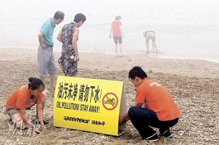 環(huán)保組織綠色和平昨日指出,受漏油意外污染的大連一帶海域,黑色油污已漸被清理,但海面仍漂浮油層。為保護(hù)游客安全,綠色和平在棒棰島等海濱浴場已豎立警示牌,提醒游人“油污未凈,請(qǐng)勿下水!”