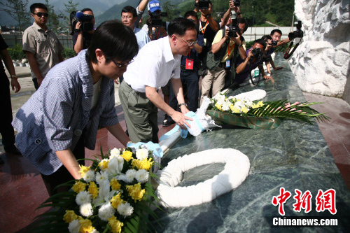隨后,曾蔭權(quán)一行來到漩口中學地震遺址。烈日下,曾蔭權(quán)肅立默哀,向汶川大地震遇難者和在抗震救災(zāi)中英勇犧牲的烈士三鞠躬,獻花祭奠。
