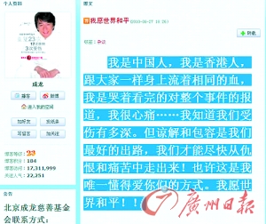 成龍25日的言論在微博上發(fā)表后,隨即在網絡上瘋傳,在各大網絡的討論區(qū)都推出了這次成龍言論的專題,網友們紛紛對成龍表示很不滿。