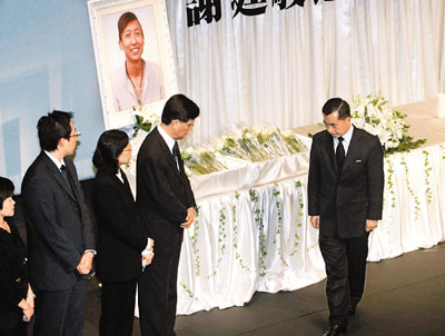 為表敬意,劇院內(nèi)的紅色椅子鋪上白布,禮臺(tái)擺放謝廷駿生前一張展露燦爛笑容的照片,旁邊豎立一個(gè)鮮花砌成的心形花牌,臺(tái)前則擺放香檳色玫瑰花束。追思會(huì)開始后,先為謝廷駿默哀1分鐘,寂靜的空氣和悄悄爬到各人臉上的淚珠,猶如寄托無限綿長的哀思,向另一國度的謝廷駿致敬。其后,大會(huì)播放謝廷駿生前的照片,襯以他生前最愛的歌曲《海闊天空》作背景音樂,謝廷駿部分好友、同事及瑜伽教練隨后輪流上臺(tái),思憶著跟謝廷駿相處的點(diǎn)滴,淚水再度灑下……
