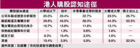 不過(guò),即使在表示會(huì)初步了解公司資料者中,也有48.8%主要是透過(guò)“報(bào)紙報(bào)道及專欄分析”作為資料來(lái)源,13.1%則根據(jù)“電臺(tái)及電視節(jié)目推介”,只有24.7%的主要資料來(lái)源是“公司年報(bào)或證券行分析報(bào)告”。