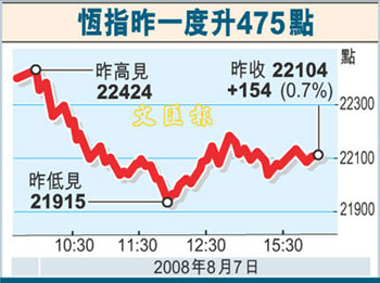 輝立資產(chǎn)管理策略師陳煜強表示,由于全球經(jīng)濟放緩,股市仍未見可突破的機會,加上預(yù)期奧運期間,內(nèi)地不會有新措施出臺,估計恒指短期內(nèi)只會在22000點左右徘徊。