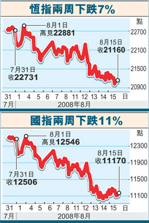 港股上周下跌725點,跌幅3.3%。大福資料研究高級經(jīng)理曹福達表示,港股正處于熊市二期,走勢相當反復,但相信在奧運后,股市有較顯著的反彈,而交投也將會再度活躍,令后市走勢明朗化。