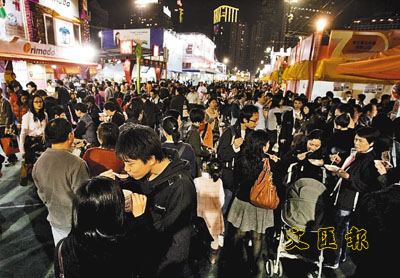 香港工展會(huì)會(huì)場(chǎng)內(nèi)人頭涌涌,在平安夜中,更愈夜愈精彩。面食、醬油及日常用品銷售仍然暢旺,而售賣應(yīng)節(jié)物品的攤位更受入場(chǎng)人士歡迎。