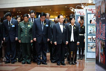 12日下午2時28分,香港文化中心一片肅穆。在參觀“蜀港同心大愛無疆──汶川大地震一周年紀念圖片展”后,曾蔭權(quán)與高祀仁連同駐港部隊司令員張仕波少將、中聯(lián)辦副主任李剛、外交部駐港副特派員詹永新、政制及內(nèi)地事務(wù)局局長林瑞麟、民政事務(wù)局局長曾德成和勞工及福利局局長張建宗等一眾嘉賓,一同肅立默哀一分鐘,哀悼汶川大地震遇難同胞。