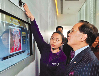 為推介香港館,煲呔(曾蔭權(quán))不惜“粉墨登場(chǎng)”扮演粵劇大老倌?非也,原來(lái)香港館在入口處歡迎參觀者的是一個(gè)計(jì)算機(jī)造型游戲,曾蔭權(quán)親身上陣,一試游戲:“毋須粉墨也能裝一下大老倌,然后把趣怪扮相電郵給朋友。”