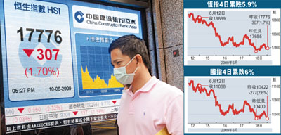 中新網(wǎng)6月19日電 據(jù)香港《文匯報》報道,港股連續(xù)第4個交易日下跌,恒指18日剛開市便急挫,失守18000點大關(guān)后,瞬即落至全日最低位17655點,連17700點也守不住,午后跌幅雖一度收窄,但臨收市沽壓又再度重現(xiàn),全日收報17776.6點,跌307.9點,成交額639億元。