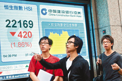 中新網(wǎng)10月28日電 據(jù)香港《文匯報》報道,外圍股市跌,拖累港股在臨近期指結(jié)算前急挫,恒指27日隨美股疲軟而低開573點,其后跌幅一度收窄至不足400點,但午后內(nèi)地股市“插水”,大跌近3%,恒指下午再一輪下跌,結(jié)果全日跌420點,收報22169.5點,跌1.86%,是三周以來最大跌幅,港股成交額739億元。